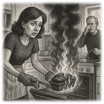 I mixed and stirred with loving care and picked out the egg that got stuck in my hair. The oven was preheated; the bread pan was greased, and we were so looking forward to our early morning feast. Something odd, my batter was too runny! Was that three eggs or six too many? I shrugged and thought, “It’ll bake just fine.” So, I poured it in the bread pan, stuck it in the oven and said a little prayer. Then just to pass some time I downed the end of the bottle of last night’s white wine. Fifteen minutes later a smell began to grow; not lovely banana bread but acrid black smoke, you know? I peeked through the glass and saw the batter had overflowed. The oven was on fire and shouted. "Lady, stand back! I'm about to explode!" Then the fire alarm screamed and a moment later my husband rushed into the kitchen like the emergency rescue team. He was dragging the garden hose and covering his nose with a dirty sock. He gasped with a life-threatening cough, "Is this the dessert, or something cooked up by Comrade Molotov?" He put the fire out and aired out the house while I scraped up the mess. Then he gave me a hug to help calm my distress and quietly said. "It's okay dear, you did your best." I sheepishly said, “No banana bread, but we still have toast and your favorite jam instead. I am really sorry honey. But I will bake another banana bread right after lunch.” After we had our toast he rushed off in his pickup truck to go into town. On his return he explained that he bought additional fire insurance after I promised him that I was going to make it again. ~~~