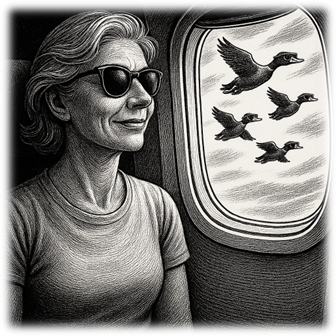 These wintery mornings I`m sleeping later and later. Sandy is snoring peacefully as I pull my warm hands and nose and toasted feet out from under our nice warm sheets. My bare feet run like scared cats across the ice-cold floor to the spare cupboard to find my warmest boots. Soon my poor frozen feet are starting to thaw out in my wonderful warm Ugg boots. Minutes later, I am holding my steaming coffee mug close, with both hands pleasantly warming while sipping the hot tasty brew. I am trying to see the normally pretty view from our living room window, which is now all frosted up. Nothing seems to move out there. It is like a graveyard on a dismal rainy day where everything is very still and grey. I am concerned about getting older because it takes me much longer to warm up on these very cold mornings. This makes me think about the ducks. I appreciate their wisdom. Not so long ago they all migrated south for the warmer weather. So, I have just decided to take a hint from the ducks. We are going to fly south and stay with my friend Wendy who lives in Miami. We will go to the warm, sunny beach every day for the rest of this miserable winter! I act quickly! I walk into the bedroom, shake Sandy, and give him the good news, “Wake up! You have to get packed; we have a plane to catch!” On the way to the airport Sandy asked me if it was okay with Wendy if we come, and I replied, “I am sure it’s okay, I will ask her when we get there!” ~~~
