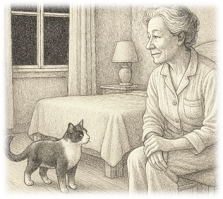 I was staying with friends and late one night I was alone in my room, when in walked an elegant black and white cat. I could not even hear her soft pads on the wooden floor. She carefully explored the room, checking every corner; not talking or stalking nor expecting anything more. Then, after a moment or two she gave a little meow, as if to say, “The inspection is over now." She turned and politely walked away. A dutiful cat who had no further reason to stay. I felt honored to be made welcome and was greatly relieved to know that my presence in the house had been officially approved.